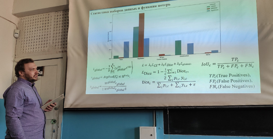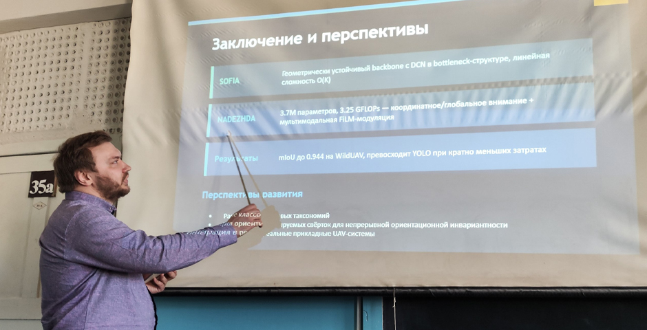 Делегация молодых специалистов ФГБНУ «ИПИИ» активно участвовала в работе конференции. Наши сотрудники приняли участие в работе разных секций, участвовали в обсуждении докладов. Особого внимания заслуживает выступление заведующего молодёжной лабораторией, кандидата технических наук Ярослава Сергеевича Пикалёва. Учёный представил доклад на тему: «Нейросетевая модель Nadezhda для семантической сегментации ключевых объектов на аэрофотоснимках беспилотных летательных аппаратов».